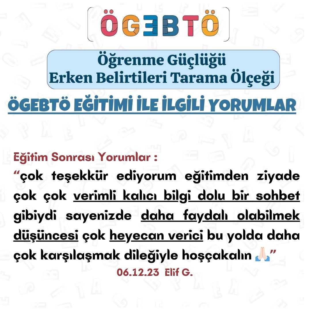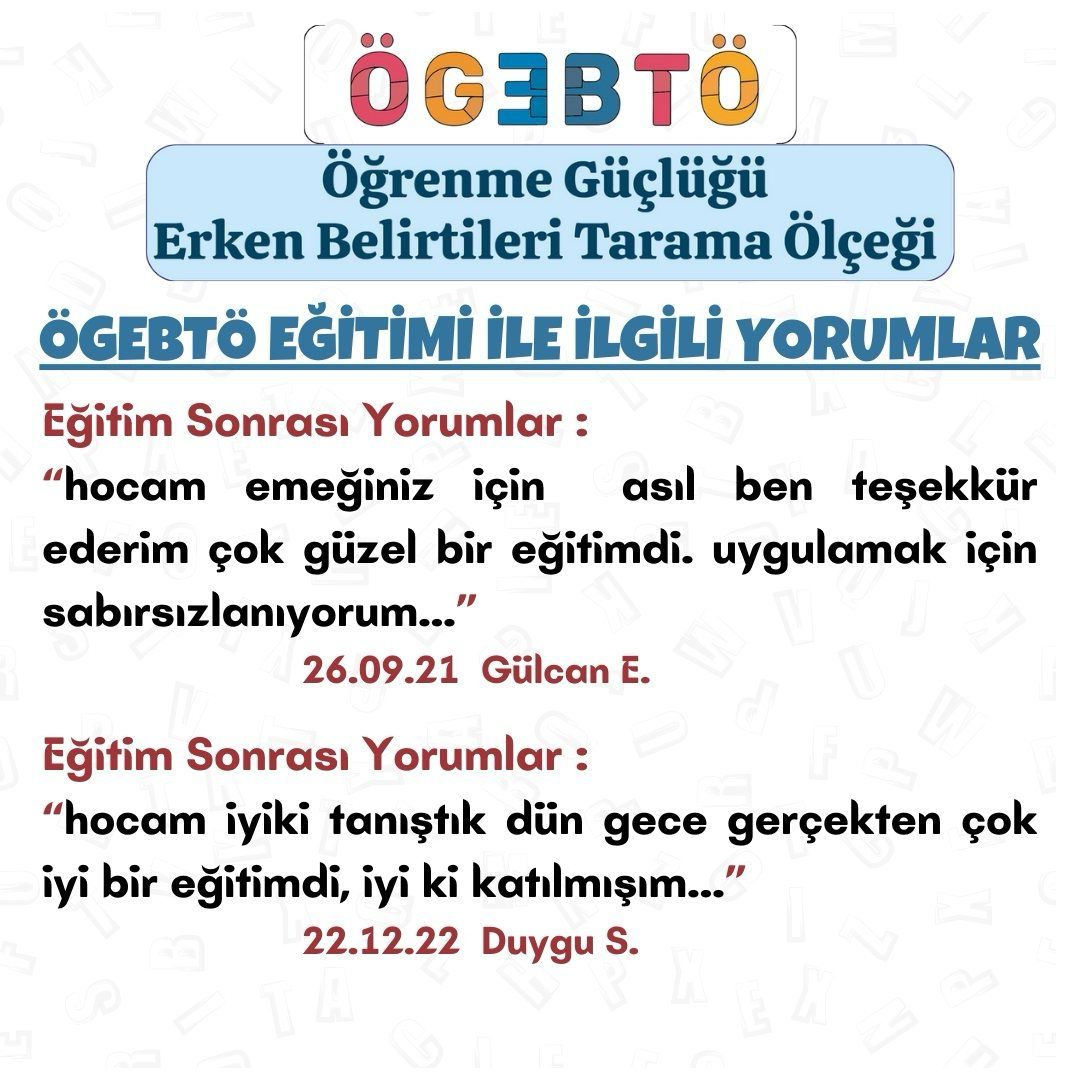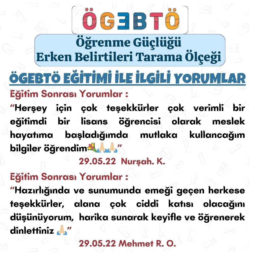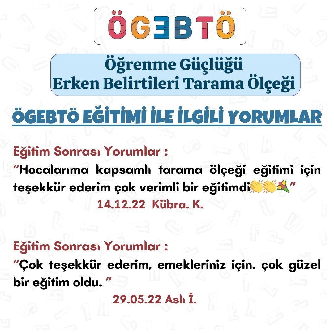 ÖGEBTÖ Öğrenme Güçlüğü Erken Belirtiler Tarama Ölçeği (ÖGEBTÖ) , öğrenme güçlüğü davranışlnı sergileyen 4-6 yaşlar arasındaki çocukların değerlendirilmesini ve öğrenme güçlüğü riskinin ortaya konulmasını amaçlayan gelişimsel bir ölçme aracıdır.