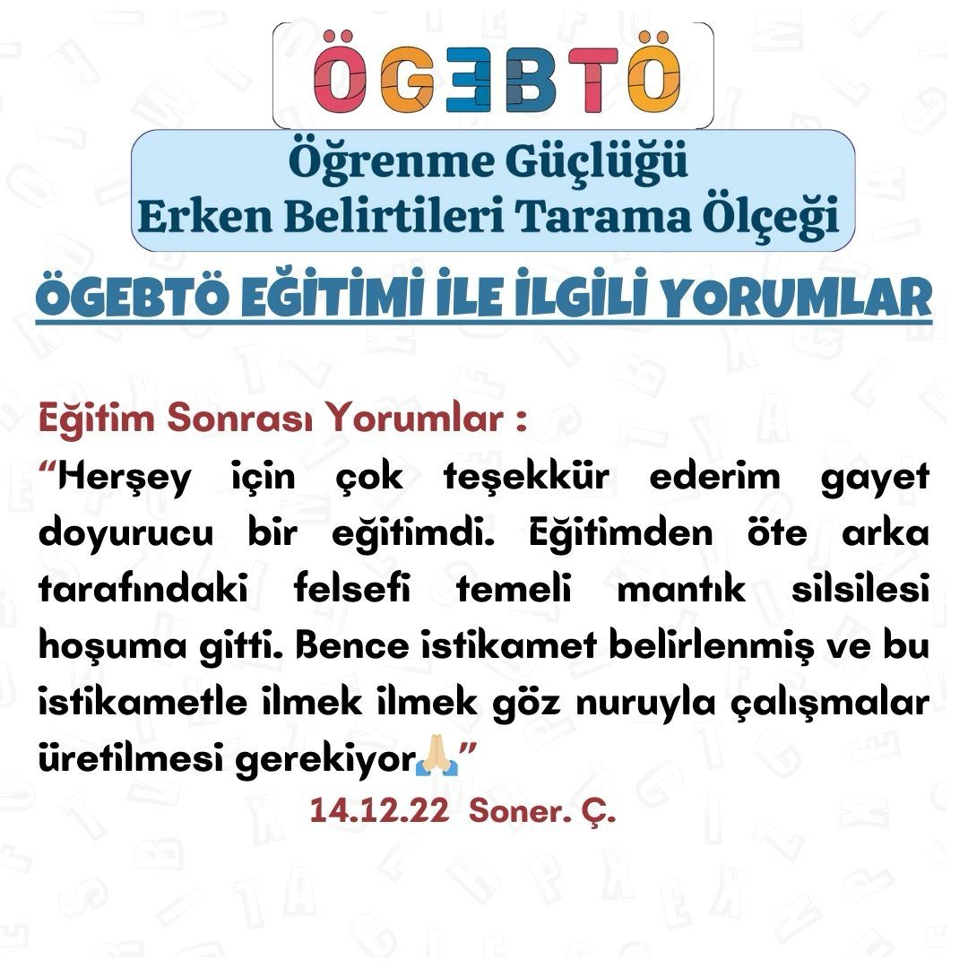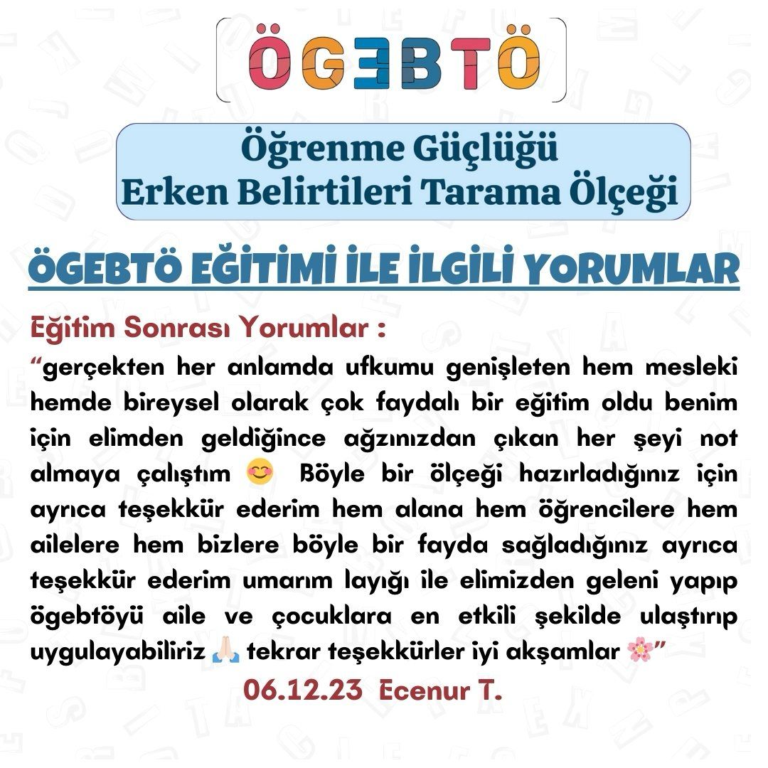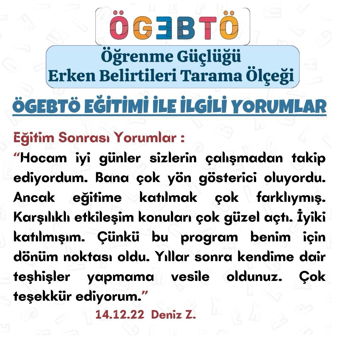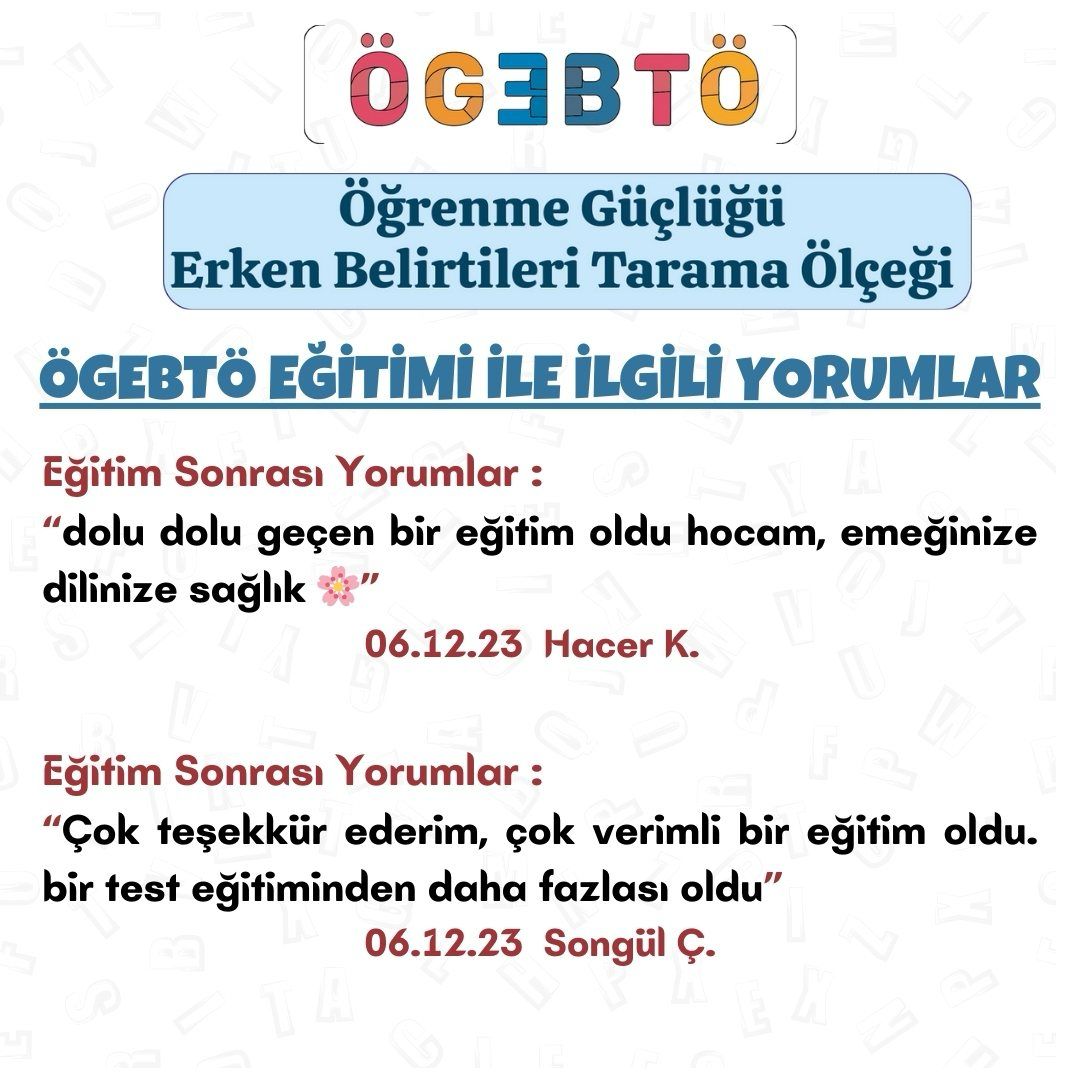 ÖGEBTÖ Öğrenme Güçlüğü Erken Belirtiler Tarama Ölçeği (ÖGEBTÖ) , öğrenme güçlüğü davranışlnı sergileyen 4-6 yaşlar arasındaki çocukların değerlendirilmesini ve öğrenme güçlüğü riskinin ortaya konulmasını amaçlayan gelişimsel bir ölçme aracıdır.